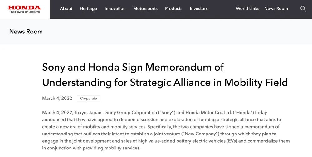 索尼和本田两方签署的谅解备忘录显示,双方已经决定成立一家合资公司,将继续就执行细节、约束条款进行谈判,并达成联合开发协议和合资协议的最终版本。