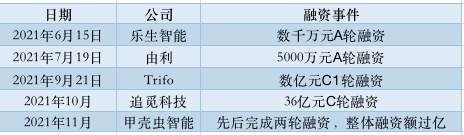 在二级市场之外,融资项目也接连发生:2021年6月15日,乐生智能宣布完成数千万元A轮融资;7月19日,由利完成5000万元A轮融资;9月21日,Trifo完成数亿元C1轮融资;10月,追觅科技完成36亿元C轮融资,刷新行业融资记录;11月,甲壳虫智能宣布先后完成两轮融资,整体融资额过亿。