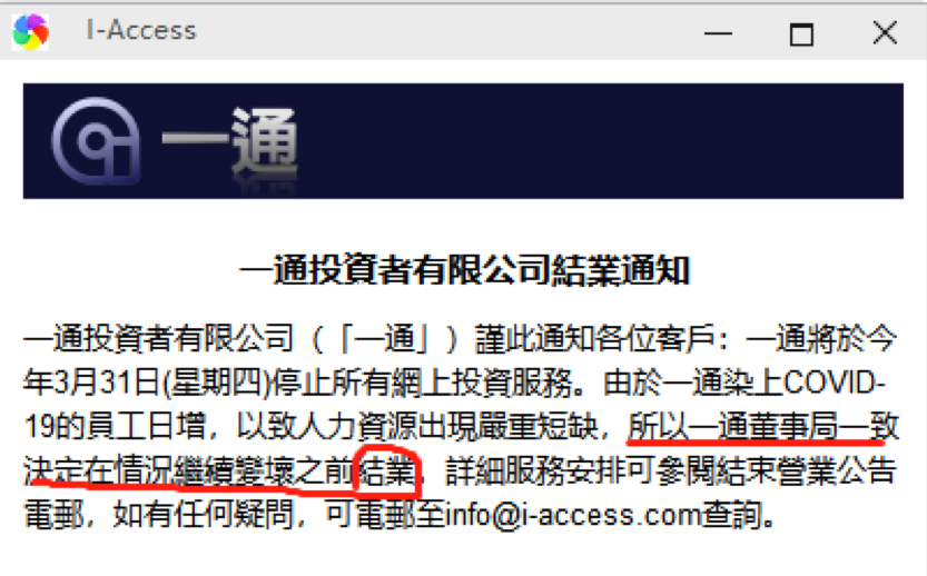 近日,香港网上券商一通投资者有限公司(以下简称“一通”)发布官方邮件,宣布公司将于3月31日结束营业,并将关停所有网上投资服务。