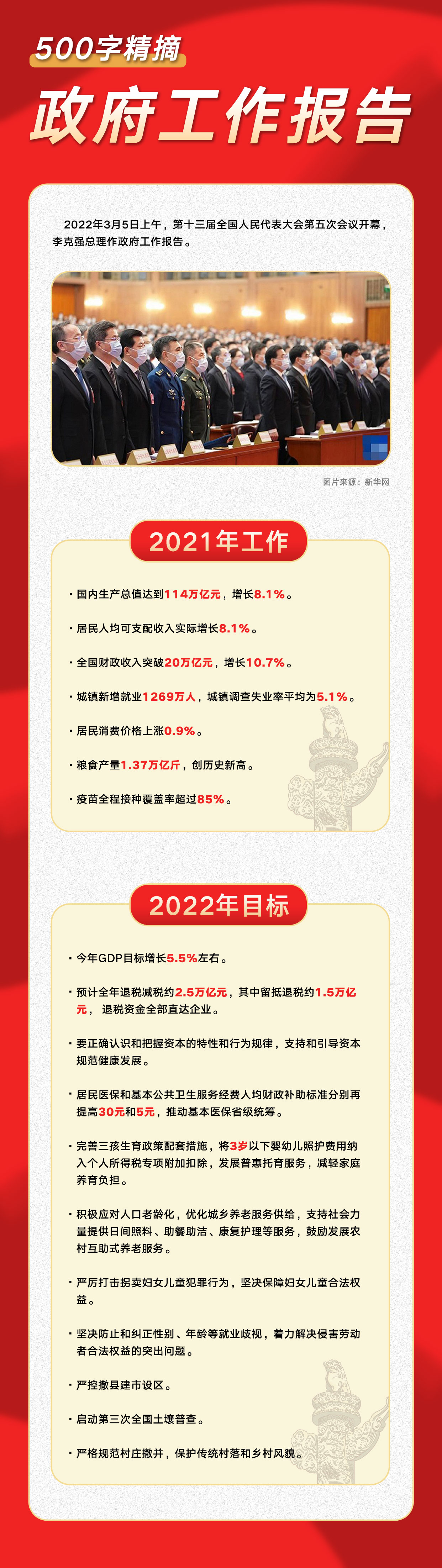2022年3月5日上午,第十三届全国人民代表大会第五次会议开幕,李克强总理作政府工作报告。