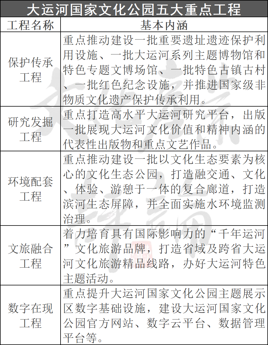 在国家文化公园建设工作领导小组颁布的《大运河国家文化公园建设保护规划》(下简称为《保护规划》)中,还明确了五大重点建设工程,每一个都是分量十足。