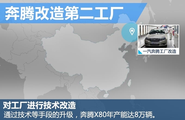 目前一汽奔腾共拥有一工厂、二工厂两座生产基地,规划年总产能为 40 万辆。第二工厂用于生产奔腾 B50、B70、B90 系列以及奔腾 X80车型,其中第二工厂的年产能为20万辆(双班)。在本次公告中,奔腾汽车将对一工厂内冲压车间和二工厂内焊装、涂装和总装车间进行技术改造,以实现新一代奔腾X80车型每年80,000辆的生产能力,据悉,换代奔腾X80将于2018年推向市场。