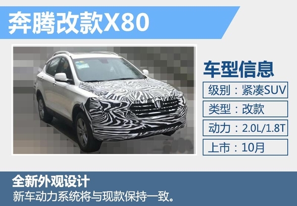 在新一代车型推出之前,今年10月份奔腾X80将迎来全新改款,新车采用全新的前脸设计,还将首次装配10寸液晶中控屏并置入手机智能互联系统,动力系统将与现款车型保持一致。分别搭载1.8T涡轮增压发动机以及2.0升自然吸气发动机。与发动机匹配的传动系统,将是6速自动变速箱和6速手动变速箱。