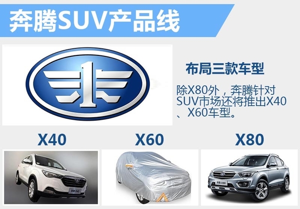根据奔腾汽车对于SUV产品的规划,未来除奔腾X80外,还将推出X40和X60车型。X40定位于小型SUV市场,有望于2017年问世;X60为一款全新紧凑级SUV产品,市场定位低于X80,具体上市时间预计到2018年。