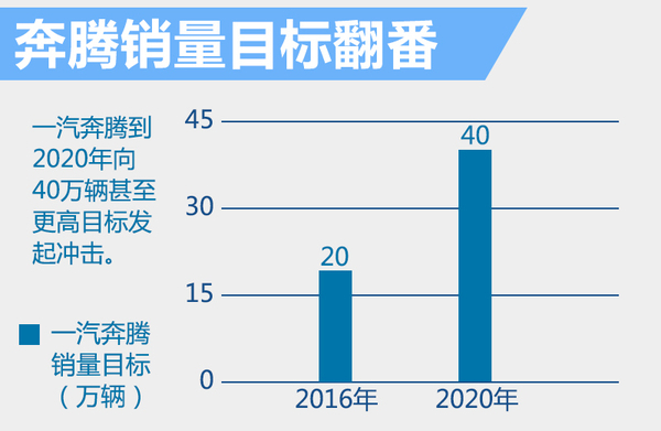 一汽奔腾为今年制定了挑战18万或20万辆的目标,到2020年则将向40万辆甚至更高目标发起冲击。目前一汽奔腾品牌已形成M平台和全新A级车平台两大整车平台。在“十三五”期间,一汽轿车将锁定这两大产品平台,推进平台模块化开发战略,加速新产品的研发和投放将为销售目标的完成提供助力。