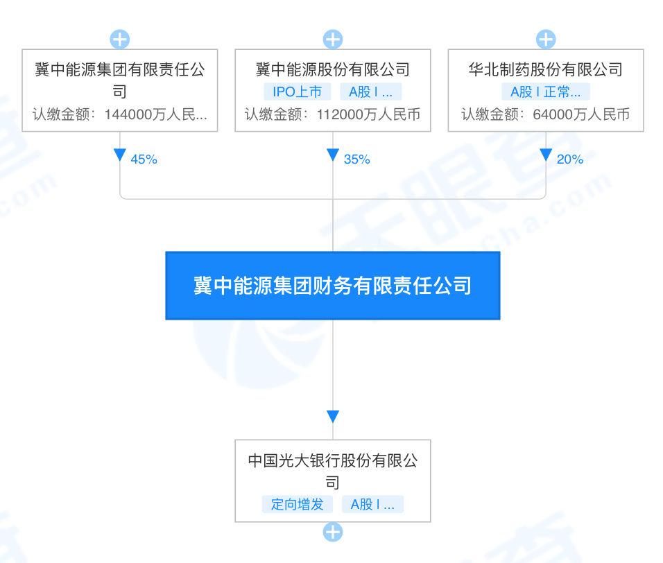 从天眼查可以看到,冀中能源集团财务有限责任公司有3个股东,其中冀中能源的控股股东冀中能源集团有限责任公司(下称冀中集团)控制45%,冀中能源自己控制35%,另一家上市公司华北制药(600812.SH)控股20%。