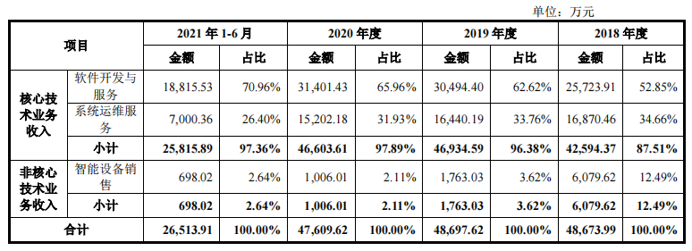 目前来看,用友汽车有软件开发与服务、系统运维服务这两大核心业务,还有三大“拳头”产品:车企营销系统、车主服务平台、汽车产业生态服务平台。2018年~2020年及2021年上半年,用友汽车的核心技术业务收入,占营业收入比重分别为87.51%、96.38%、97.89%和97.36%。