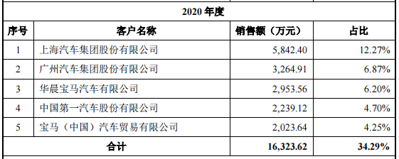 而用友汽车的大客户都赫赫有名,如上汽、广汽、一汽、宝马中国、华晨宝马、福特汽车等,并且都为其贡献了不少的收入。2020年,用友汽车前五大客户对应销售额占比合计为34.29%,2021年上半年该比例达到48.32%。