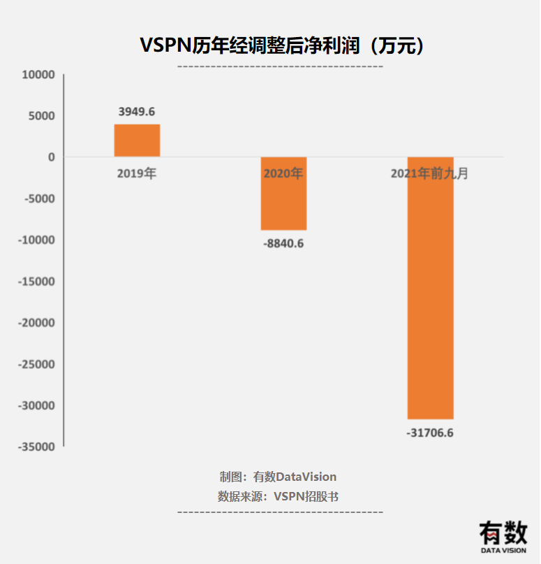 根据招股书显示,VSPN2019-2020年营收分别为9.27亿与8.92亿,一看2020年毛利,1.5%,更别提净利润了,两年分别为经调整后3949.6万与亏损0.88亿元。产生巨额亏损的原因官方解释为主要受新冠疫情的影响,但即使新冠疫情好转的2021年,前九月经调后亏损3.17亿元。