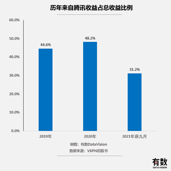 VSPN背靠腾讯这种参天大树,招股书中反复提到腾讯227次,那么有腾讯一口肉吃,自然应该有它一口汤喝,但实际上并没有想象的那么美好。