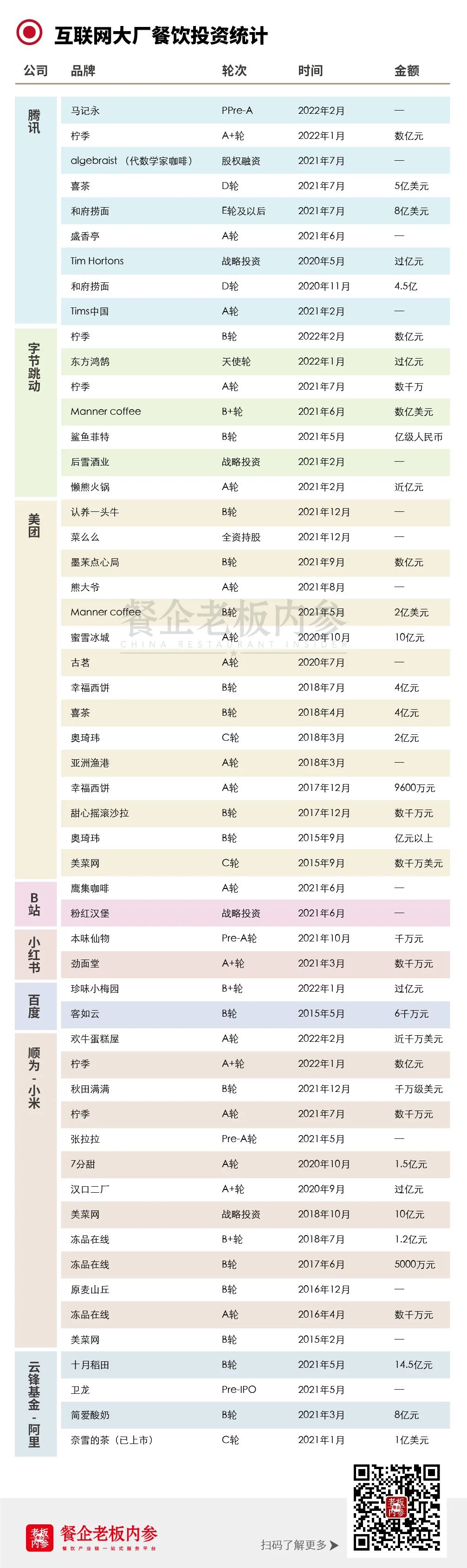 而美团、字节跳动、B站、小红书,甚至连号称“再已不碰餐饮”的百度,都在积极布局餐饮新消费,投资金额和频率都屡创新高。