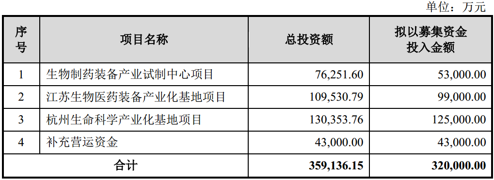 按照计划,该公司本次最高融资32亿元中,将主要投向“生物制药装备产业试制中心”(5.3亿元,占比16.6%)、“江苏生物医药装备产业化基地”(9.9亿元,占比30.9%)、“杭州生命科学产业化基地”(12.5亿元,占比39.1%)项目及补充流动资金(4.3亿元,占比13.44%)。