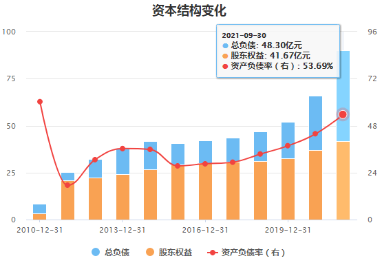 从上市公司资金情况来看,东富龙当前面临上市11年以来最高的资产负债率,截至2021年9月30日约为53.69%,远高于2020年年底的43.86%。数据显示,到2021年9月底,该公司总负债48.3亿元,流动负债47.72亿元,货币资金19.37亿元。