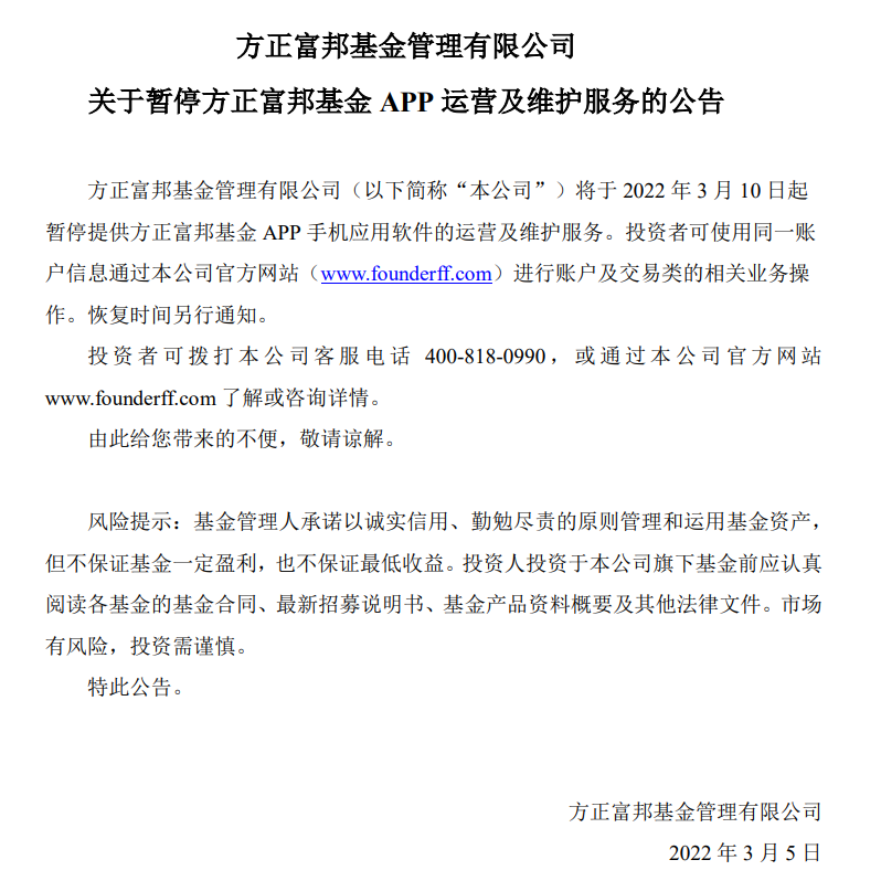 对于中小公募来说,自营的APP业务似乎正在成为“食之不得弃之可惜”的鸡肋。3月5日,方正富邦基金发布了《暂停APP运营及维护服务的公告》。公告宣布自3月10日起暂停提供方正富邦基金APP手机应用软件的运营及维护服务。