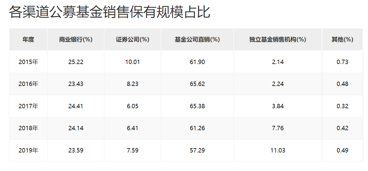 中国基金业协会数据显示,自2015年-2019年,公募直销渠道在基金销售的保有规模占比逐渐遍地,从61.9%逐渐降低到57.29%,而独立销售机构的保有规模占比却从2.14%上升到11.03%。