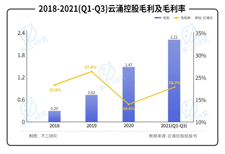 「不二研究」认为,或是由于游戏机业务的增加,使得公司整体毛利率被拉低。2018-2020年,以及2021年前九个月,云涌控股毛利率分别约为23.8%、27.4%、14.6%及18.3%。对比同期销售成本,分别约为0.94亿港元、1.65亿港元、8.65亿港元及9.92亿港元。