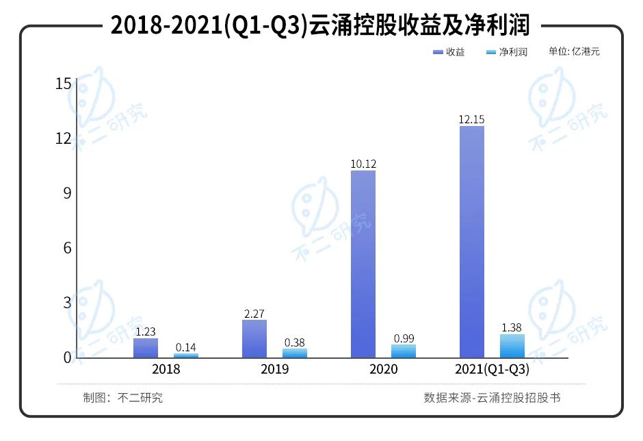 据招股书显示,2018-2020年,以及2021年前九个月,云涌控股收益分别为1.23亿港元、2.27亿港元、10.12亿港元和12.15亿港元;净利润分别为0.14亿港元、0.38亿港元、0.99亿港元和1.38亿港元。