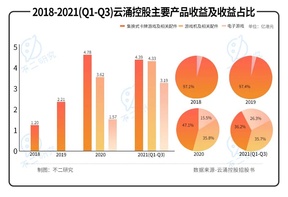 据招股书显示,2018-2020年,以及2021年前九个月,集换式卡牌游戏及相关配件收益分别为1.20亿港元、2.21亿港元、4.78亿港元和4.39亿港元,占总收益的97.1%、97.4%、47.1%和36.2%。毛利率22.8%、27.6%、26.2%和37.1%。