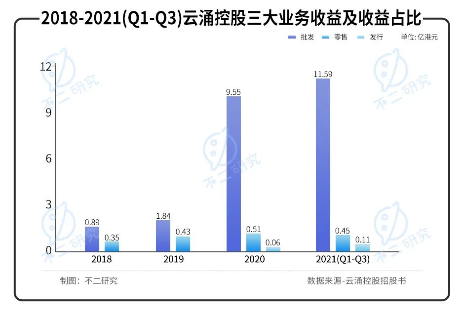 据招股书显示,2018-2020年,以及2021年前九个月,来自批发的收益分别为0.89亿港元、1.84亿港元、9.55亿港元和11.59亿港元,占总收益的72.0%、80.9%、94.3%和95.4%。