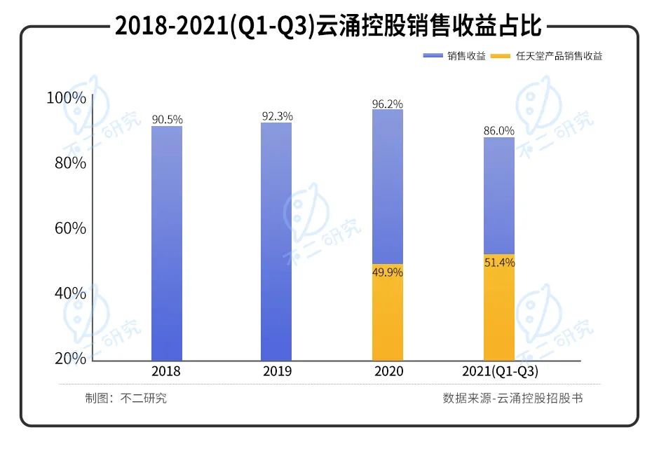 此外,招股书披露,云涌控股大部分收益来自销售多个知名品牌的游戏及收藏品。2018-2020年,以及2021年前九个月,其销售收益分别占总收益约90.5%、92.3%、96.2%和86.0%。其中,2020和2021年前九个月,任天堂产品的销售收益分别占总收益的49.0%和51.4%。