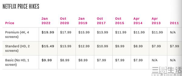 其实与国内长视频平台的数次涨价一样,Netflix与Disney+等海外平台的付费会员价格同样也进行了多次上调。其中,Netflix在2012年至2022年的十年间进行了四次调价,其标准会员(HD、2台设备)的价格也从2017年的10.99美元,增至2022年初的15.49美元;而Disney+也在2021年,从7美元/月增至8美元/月。