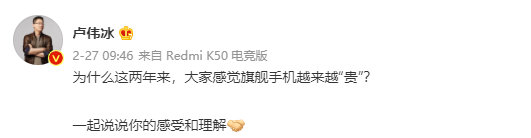 OPPO、荣耀、小米等国产手机厂商近日发布的几款旗舰机,快速蹿升的定价,让很多网友有了以上感叹。显然,网友的吐槽,智能机企业的管理层也都听到了,小米中国区国际区总裁,红米总经理卢伟冰也在微博上提出问题:为什么这两年来,大家感觉旗舰手机越来越贵?