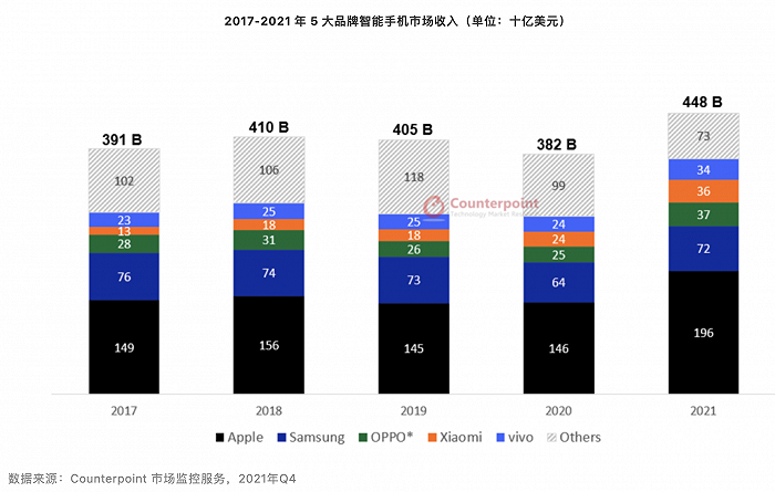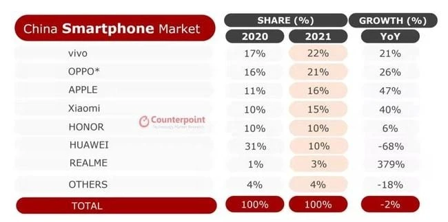 但市场份额已经在悄然发生变化,从数据来看,以量取胜的vivo,市场份额从2020年的17%,升级2021年的22%,是市场占有率第一名;OPPO 则从2021年的16%,升到2021年的21%;Apple则从11%升到16%的市场份额,吃掉了大部分华为空出的高端市场;小米则从10%升级到15%,名列国内市场第四名;荣耀则市场份额未变,华为从31%跌到10%左右。