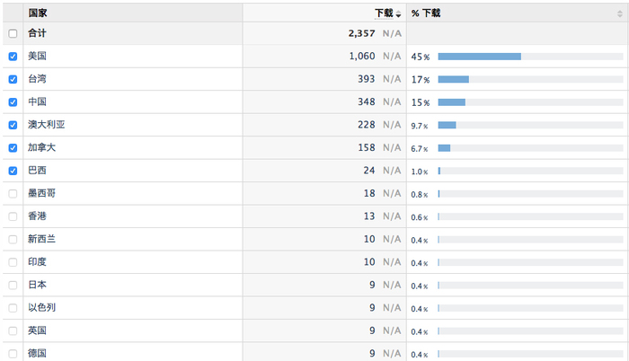 据数据显示,在一个月时间里(截止6月21日),《滚滚龟》在全球App Store一共被下载了2357次,以四舍五入2400次下载量计算: