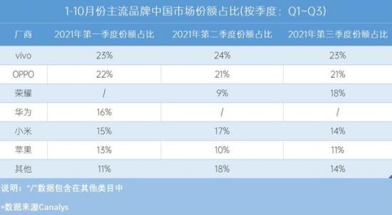 权威调研机构Canaly发布的Q3季度中国智能手机市场报告显示,在2021年第三季度,vivo以23%的份额位列第一,OPPO以20%的份额位列第二,荣耀以18%的份额位列第三,小米以14%的份额位列第四,第五则是苹果。