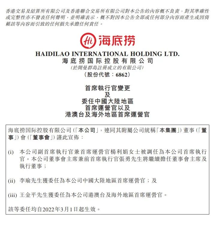 4年后的今天,杨利娟正式接棒张勇,成为海底捞的新任掌门人。公告显示,自去年11月推出的“啄木鸟计划”实施以来,公司内部管理和运营明显改善,董事会亦认可杨利娟“顾客优先、员工优先”的理念以及严格按照财务考核结果筛选及淘汰门店和管理人员的管理方式。此委任亦是强化公司治理架构的重要举措。