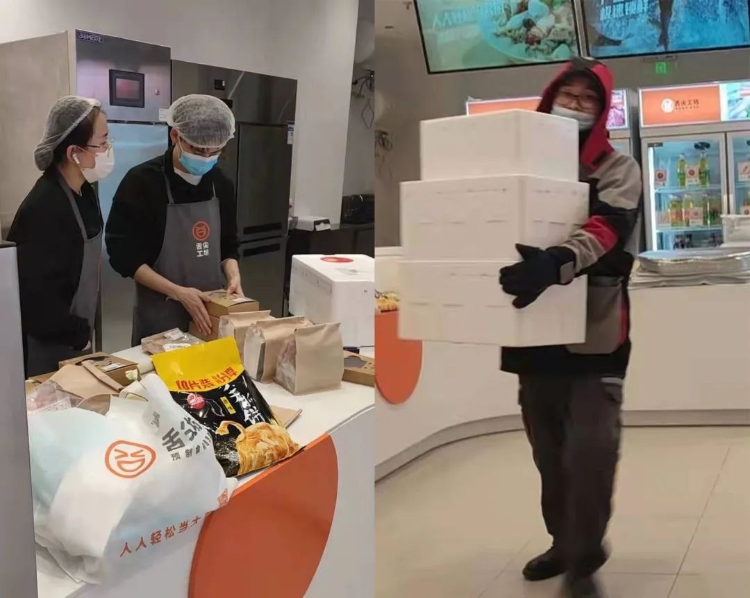 晚7点半左右,雪豹财经社看到,门店里的外卖小哥越来越多,店员忙着给预制菜打包,外卖小哥则不停地往外搬。一位店员透露,和门店自提相比,选择送货上门的用户更多。