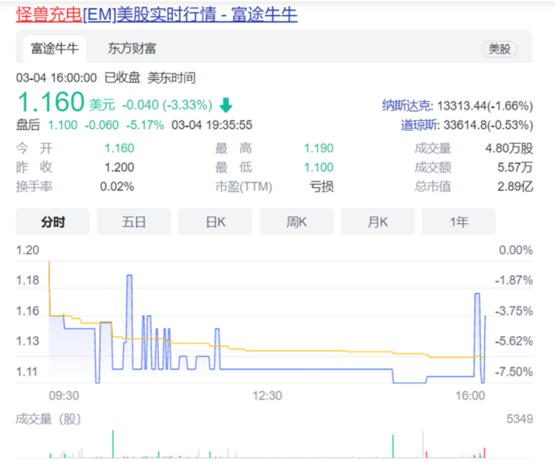 相对于寄希望冲刺上市的小电来说,已上市的怪兽充电过得也不好。在上市之初,怪兽充电的发行价为8.5美元,市值高达21亿美元。截止2022年3月4日收盘,怪兽股价已跌至1.16美元,总市值为2.89亿美元,股价已蒸发86%。