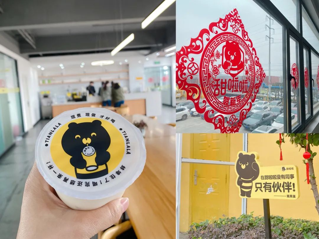 这是甜啦啦最新的IP形象“熊黑蛋”,这个去年年底才官宣的IP,已经“占领”总部:大到墙体logo,小到窗花铭牌,随处可见。