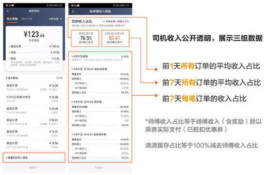 如滴滴出行从去年8月开始,在沈阳、长春、保定、秦皇岛、鞍山、淄博和安顺等地试行一键查询“司机收入报告”,报告中主要包含三组数字,第一组是前1天所有订单的平均收入占比;第二组是过去7天所有订单的平均收入占比;第三组是过去7天里每笔订单的收入占比;曹操出行则列出乘客支付、驾驶员收入、驾驶员收入占比、平台抽成占比等信息,同时,将基础信息服务费包含在订单收入中;阳光出行按照(乘客支付金额-实际收入)/实付金额计算佣金比例。