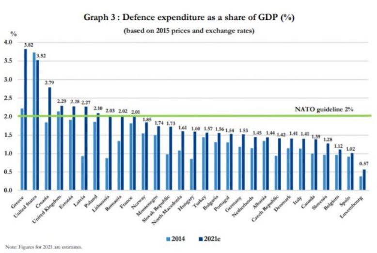 到2021年,完成2%目标的国家增至10个,新增五国分别为克罗地亚、波兰、立陶宛、罗马尼亚和法国。希腊成为国防开支占比最高的国家,达到GDP的3.82%。