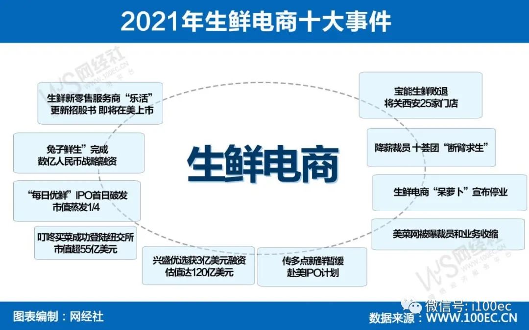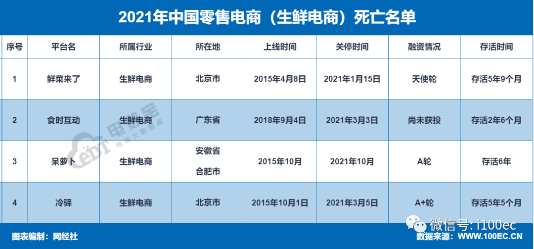 据网经社“电数宝”电商大数据库显示,2021年生鲜电商“死亡”数为4家,分别为鲜菜来了、食时互动、呆萝卜、冷驿。(注:本数据库定义的“死亡”包括公司破产、倒闭、重大重组、创始人跑路、平台关停或停更等)