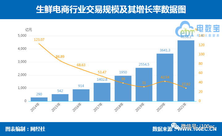 据网经社“电数宝”电商大数据库显示, 2021年生鲜电商交易规模达4658.1亿元,同比增长27.92%。