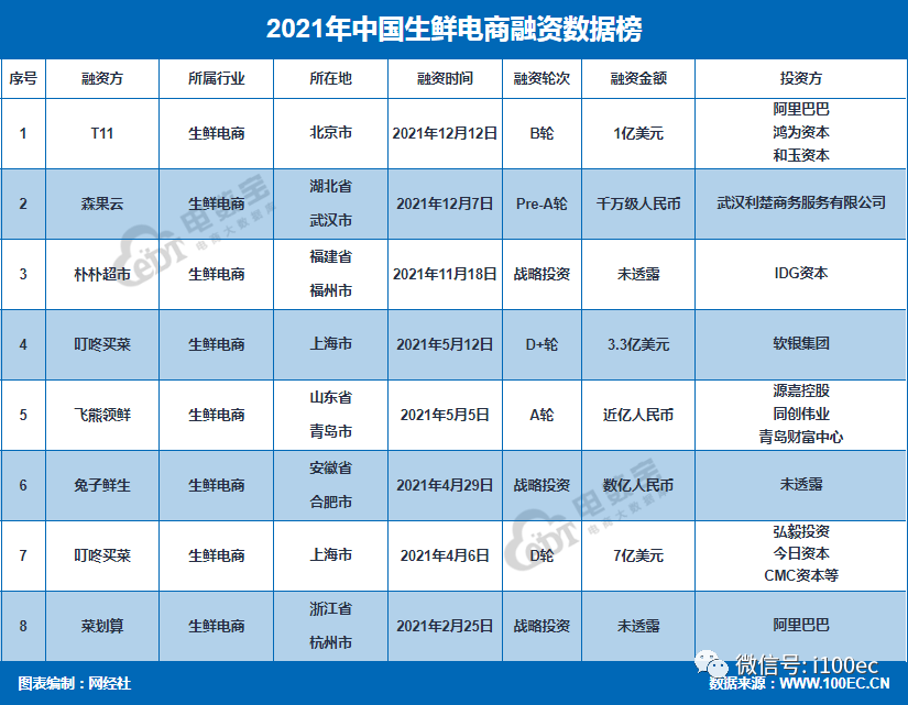 “电数宝”显示,2021年国内生鲜电商行业共发生了8起投融资事件,融资总额达80.5亿元。涉及的平台分别为:T11、森果云、朴朴超市、叮咚买菜、飞熊领鲜、兔子鲜生、菜划算。