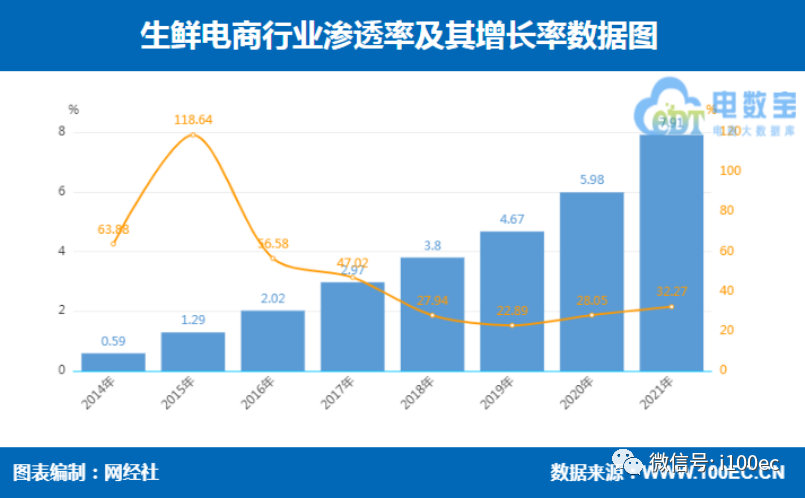 “电数宝” 显示,生鲜电商行业2021年渗透率达7.91%,此外,2014年至2020年渗透率分别为:0.59%、1.29%、2.02%、2.97%、3.8%、4.67%、5.98%。