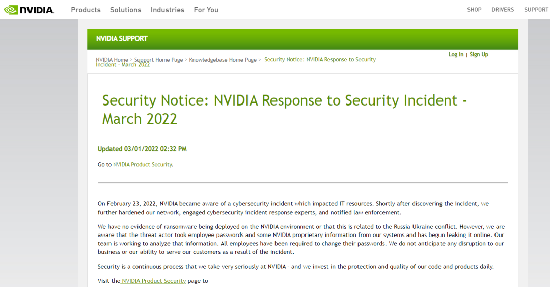 3月1日,英伟达发布官方声明:其获悉了一起影响IT资源的网络安全事件。在发现事件后不久,英伟达进一步强化了网络,聘请了网络安全事件响应专家,并通知了执法部门。