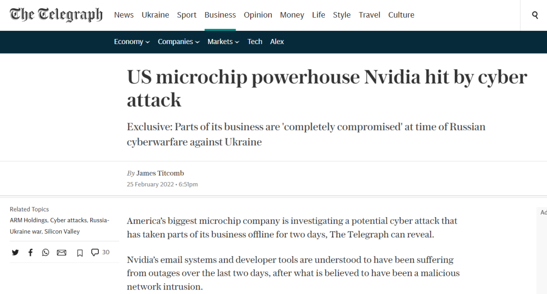 2月25日,据外媒报道,由于恶意的网络攻击,英伟达的电子邮件系统和开发人员工具在此前的两天里一直难以运作,一位内部人士称这次入侵“完全破坏”了英伟达的内部系统。