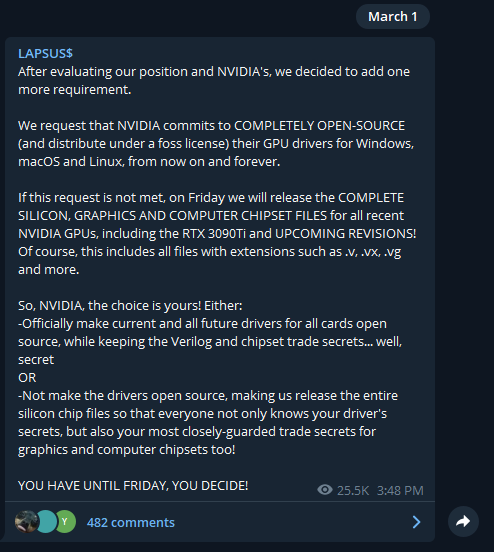 因此,LAPSUS$的勒索条件顿时引发了关注,被视为支持加密货币挖矿。上周二,LAPSUS$改变了其勒索条件,要求英伟达开源其用于macOS、Windows和Linux设备的图形芯片驱动程序,且截止时间为上周五。