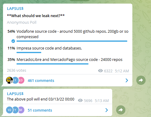 今天,LAPSUS$再次出手,让人们在英国电信公司沃达丰(Vodafone)、葡萄牙媒体集团Impresa和南美电子商务公司MercadoLibre &MercadoPago三家公司中匿名投票,选择泄露哪家公司的数据。目前,沃达丰获得了最高54%的票数,或许将成为下一个数据泄露受害者。