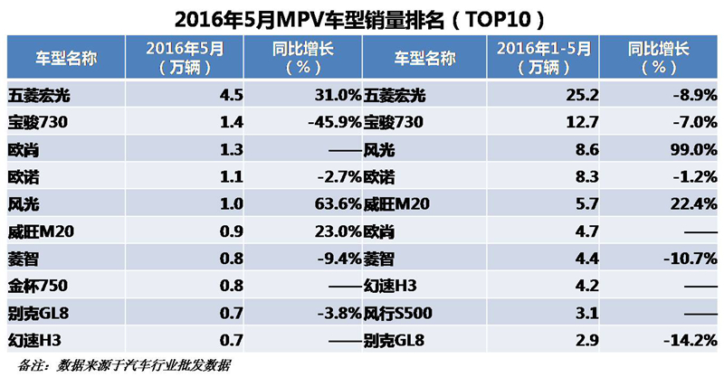 从车型层面来看,5月份MPV销量排名TOP10的车型依次是:五菱宏光、宝骏730、欧尚、欧诺、风光、威旺M20、菱智、金杯750、别克GL8和幻速H3;销量依次为:4.5万辆、1.4万辆、1.3万辆、1.1万辆、1.0万辆、0.9万辆、0.8万辆、0.8万辆、0.7万辆和0.7万辆。1-5月份MPV累计销量排名TOP10的车型依次是:五菱宏光、宝骏730、风光、欧诺、威旺M20、欧尚、菱智、幻速H3、风行S500和别克GL8;累计销量依次为:25.2万辆、12.7万辆、8.6万辆、8.3万辆、5.7万辆、4.7万辆、4.4万辆、4.2万辆、3.1万辆和2.9万辆。