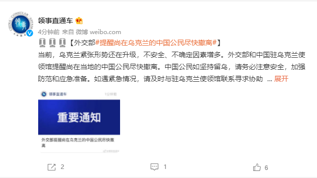@领事直通车 3月8日发布消息称,当前,乌克兰紧张形势还在升级,不安全、不确定因素增多。外交部和中国驻乌克兰使领馆提醒尚在当地的中国公民尽快撤离。中国公民如坚持留乌,请务必注意安全,加强防范和应急准备。如遇紧急情况,请及时与驻乌克兰使领馆联系寻求协助。