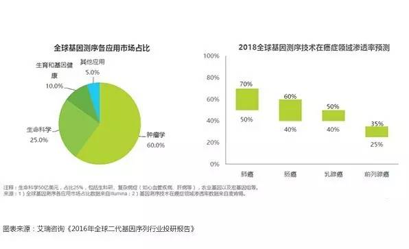 根据艾瑞咨询发布《2016年全球二代基因序列行业投研报告》预测,癌症的诊断治疗应用将是基因测序最具潜力的应用市场。
