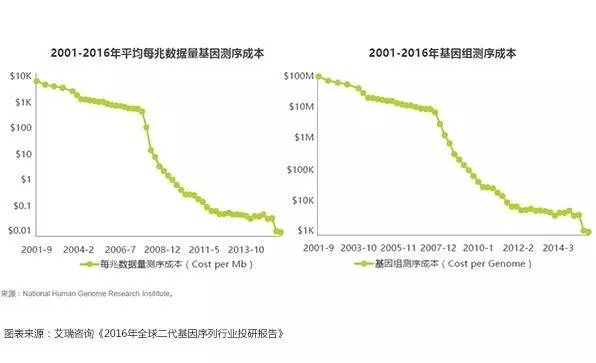 目前,高通量测序设备的广泛应用,基因数据量也呈倍数增长,基因组序列测序成本大幅下降。2016年5月,艾瑞咨询发布《2016年全球二代基因序列行业投研报告》中提到,平均每兆数据量基因测序成本和单人类基因测序成本都有超“摩尔定律”的大幅度下降,2001年人类基因组测序成本高达9526.3万美元,但如今单人类基因组测序成本已下降到几千美元。