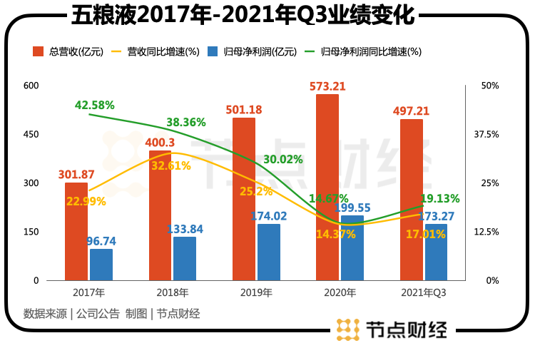2021年三季度财报显示,五粮液前三季度总营收497.21 亿元,同比增长17.01%,归母净利润173.27亿元,同比增长19.13%,增速虽然有所放缓,但考虑到疫情的因素,仍然可圈可点。