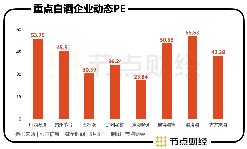 虽然白酒板块整体回调,但在“茅五泸”以及山西汾酒、洋河股份等几大白酒上市公司中,五粮液的跌幅最大。而从估值上看,截至3月7日收盘,五粮液的动态PE约为28倍,在几家同行面前也仅高于洋河股份。