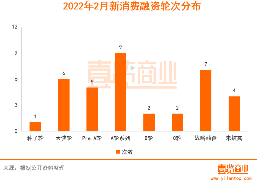 从融资轮次来看,2月新消费品牌的融资虽然仍集中在早期阶段,但发生在B轮及以前的融资占比收窄,为58%。其中A轮9起,天使轮6起,Pre-A轮5起,另有7起战略融资。
